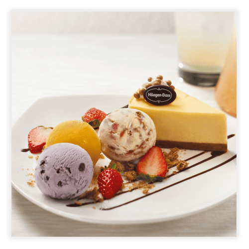 스트로베리 치즈케이크, 망고소르베, 블루베리&크림 아이스크림을 부드러운 치즈케이크와 함께 즐기는 스폐셜 메뉴.